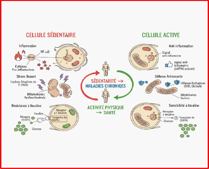 De nombreux organismes de santé soulignent que l'activité physique est très insuffisante chez de nombreux Français, contribuant à "l'épidémie" de MALADIES NON TRANSMISSIBLES (MNT) telles que le Diabète et les maladies cardiovasculaires. L'inaction est délétère, l'activité c'est la vie. L'activité physique, même courte et régulière, inverse les effets néfastes de la sédentarité au niveau cellulaire et moléculaire. Le mouvement active les gènes de l'endurance légués par Homo sapiens qui libère des protéines dont le rôle est de faire baisser l'inflammation et le stress oxydant dans l'organisme. En substance, le mouvement réactive les mécanismes biologiques et génétiques essentiels au maintien d'une bonne santé, contrastant avec l'état d'hibernation et d'encrassement cellulaire induit par la sédentarité prolongée. Bouger améliore les paramètres métaboliques.